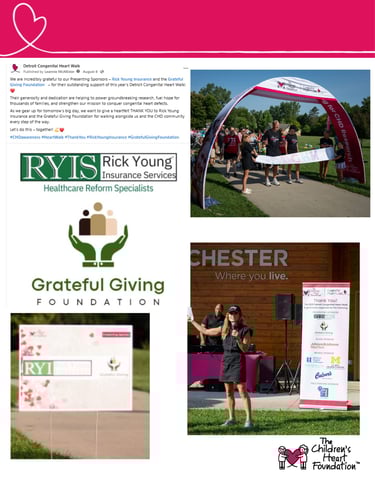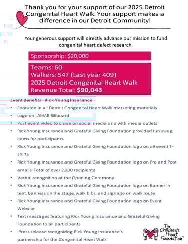 The Grateful Giving Foundation, in partnership with Rick Young Insurance, is proud to lead the way as the Presenting Sponsor for this year’s walk. Together, we are committed to making a significant impact on congenital heart defect research and supporting families affected by CHDs.